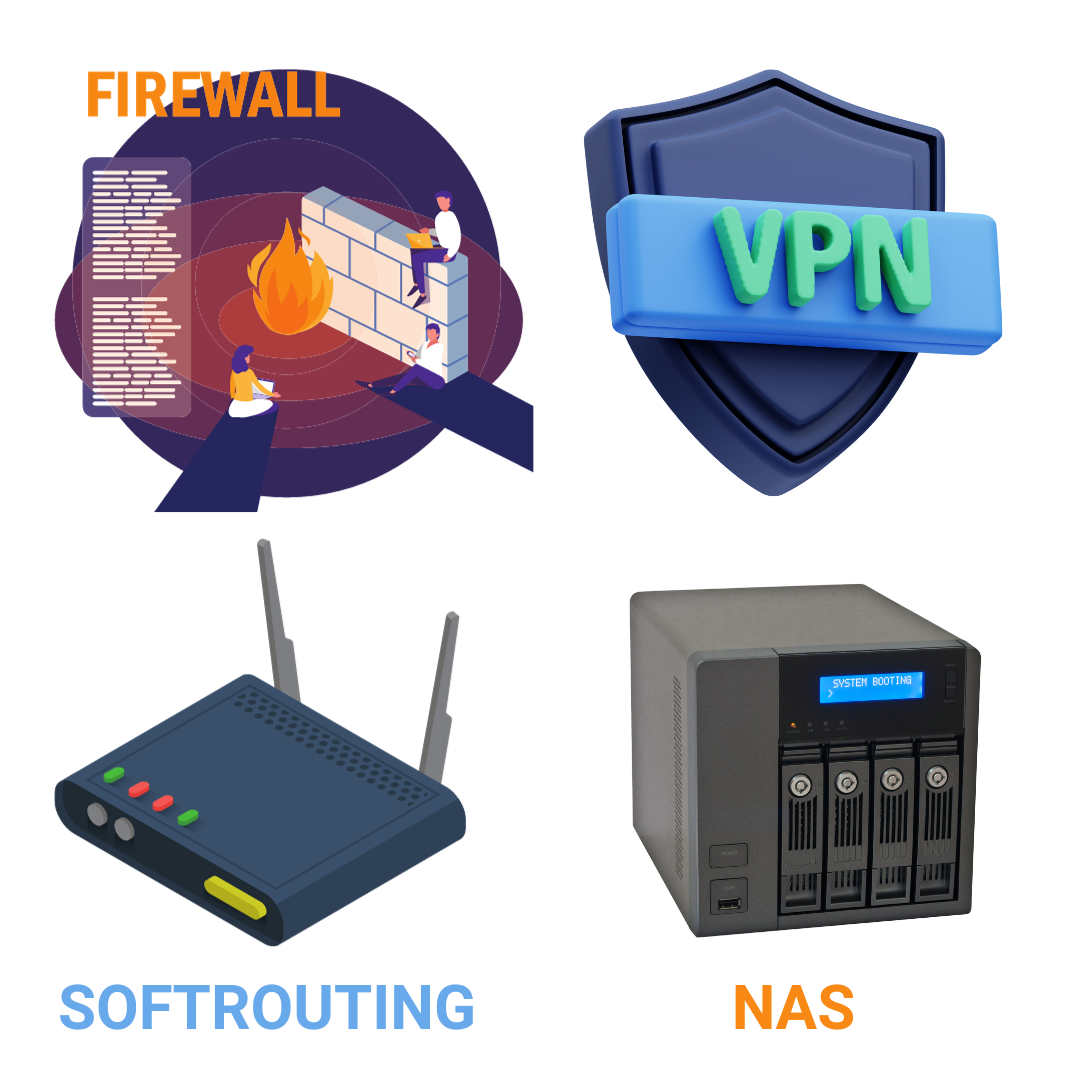 Explore a diverse range of applications including robust firewall capabilities, secure VPN server setup for remote access, softrouting to optimize network traffic, virtualization for resource efficiency, and NAS for centralized data storage and management.
